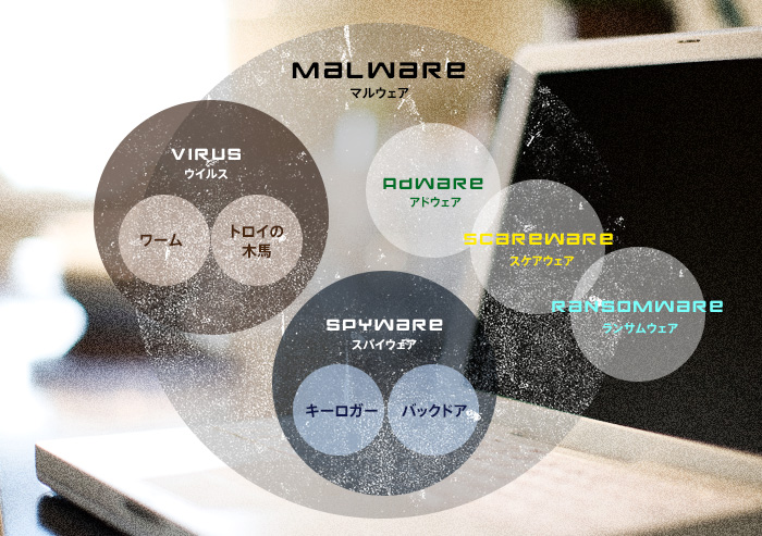 一般的に、パソコン上で何らかの悪意のある動作をするプログラムのことを「コンピューターウイルス」と呼びますが、厳密にいうと、コンピューターウイルスは「マルウェア」と呼ばれるソフトの一種です。