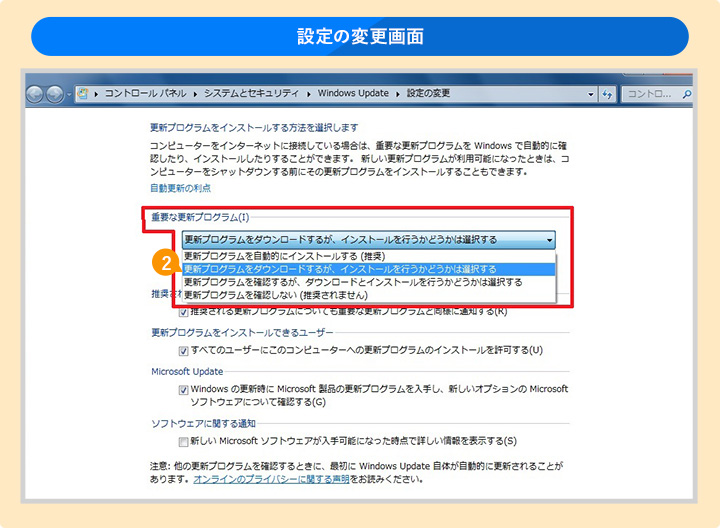 Windows7とWindows8の場合には、「コントロールパネル」→「システムとセキュリティ」→「Windows Update」を選択すると「設定の変更」という項目が表示されます。