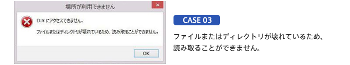 フォーマット情報、フォルダ名、ファイル名、ファイルの実データ情報などの構造情報が破損した場合に発生し、以下のような状況となります。