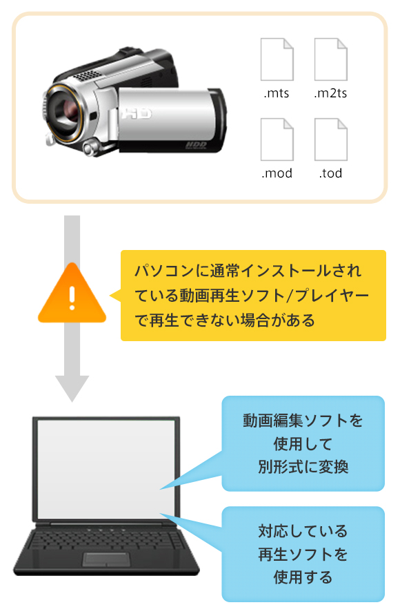これらの拡張子はビデオカメラで再生する際には問題ありませんが、パソコンに通常インストールされている動画再生ソフト/プレイヤーで再生できないことがあります。
